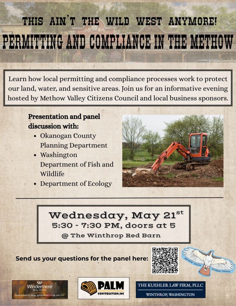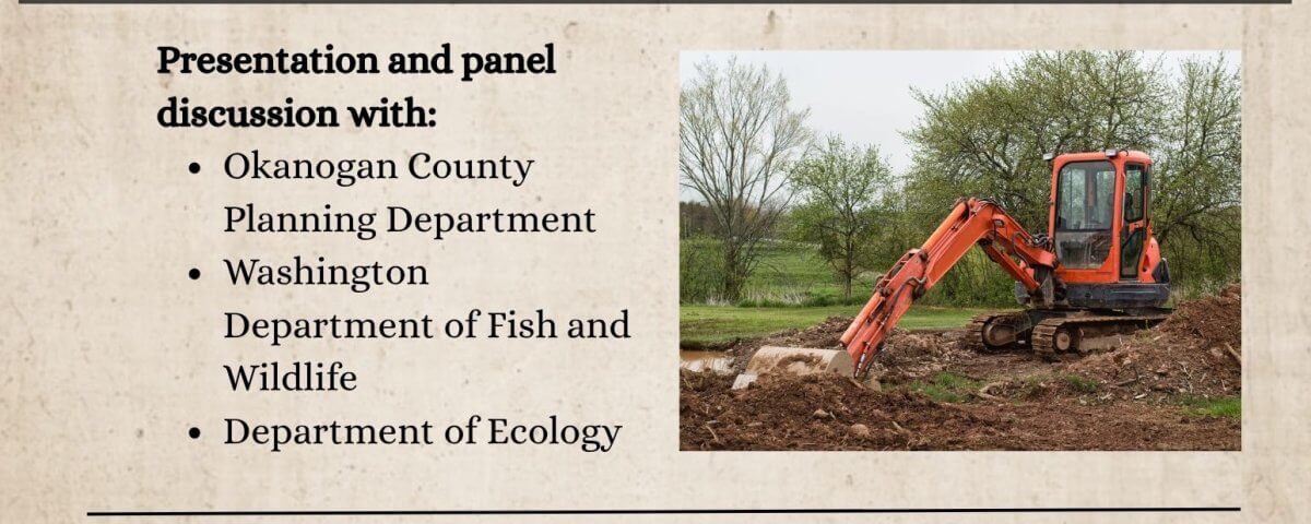 Last week nearly 70 local citizens, realtors, contractors and excavators attended the permitting and compliance workshop at the Winthrop Barn. Staff from Okanogan County Planning, the WA State Department of Ecology and the Washington Department of Fish and Wildlife were there to present and then answer questions from the audience. It was an informative discussion! If you didn’t make it, here are a few takeaways that we think everyone should know: